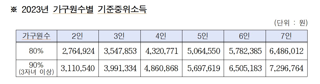 3️⃣ 동일 가구원의 소득인정액이 기준중위소득 80% 이하 가구 (단, 3자녀 이상 가구는 기준중위소득 90% 이하)